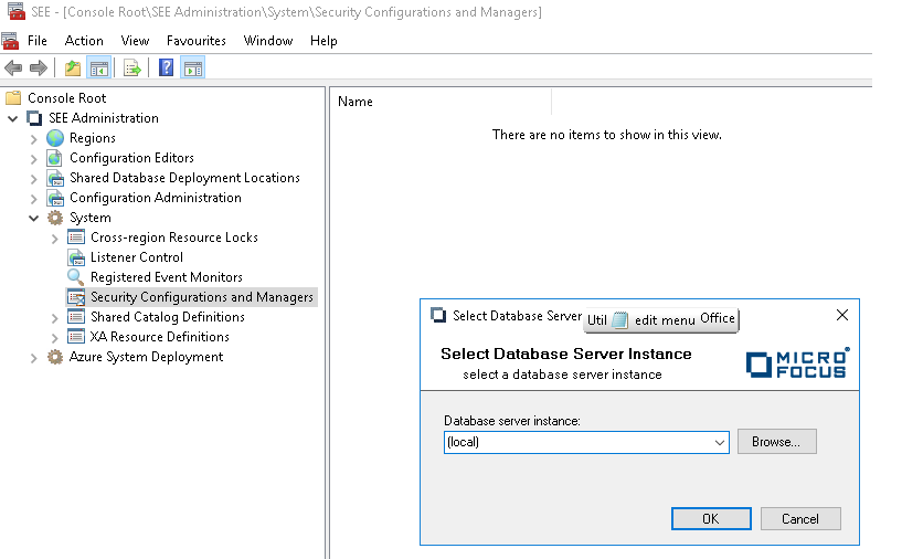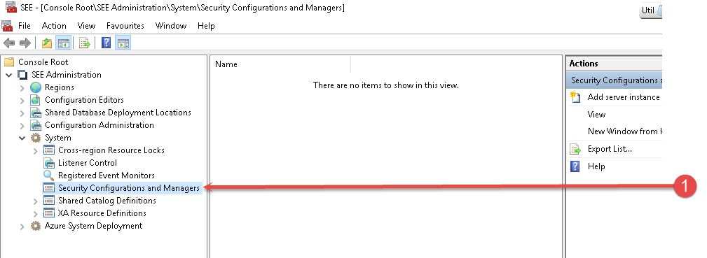 Select the System > Security Configurations and Managers node in the system, as in 1 above. Right-click and add the server instance if one is not already defined.