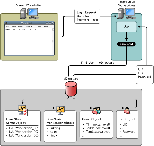 When properly configured, eDirectory objects and Linux User Management technology let you manage access to Linux resources on the network. Here's how it works: