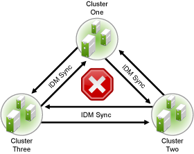 For example, in a three-cluster business continuity cluster, an Identity Manager synchronization loop occurs when Cluster One is configured to synchronize with Cluster Two, Cluster Two is configured to synchronize with Cluster Three, and Cluster Three is configured to synchronize back to Cluster One. This is illustrated in Figure 6-1 below.