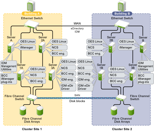 Business Continuity Clustering supports up to four peer clusters that are running OES 2023 and Novell Cluster Services.
