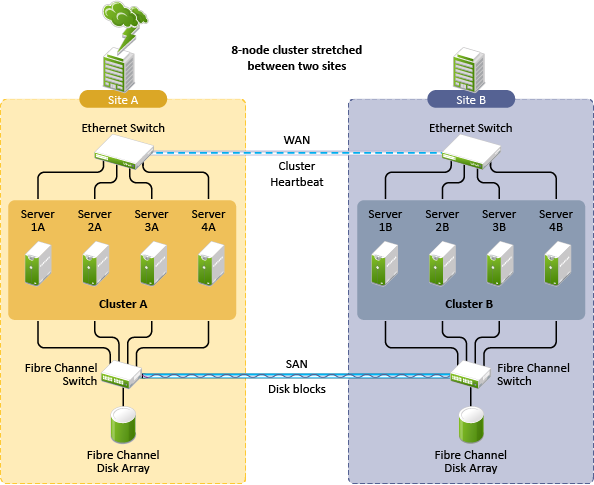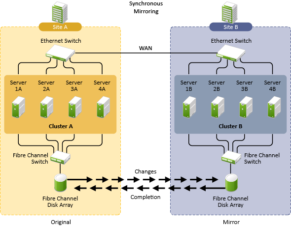 For clustering implementations that are deployed in data centers in different geographic locations, the data must be replicated between the storage subsystems at each data center. Data-block replication can be done by host-based mirroring for synchronous replication over short distances up to 10 km. Typically, replication of data blocks between storage systems in the data centers is performed by storage hardware that allows synchronous mirrors over a greater distance.