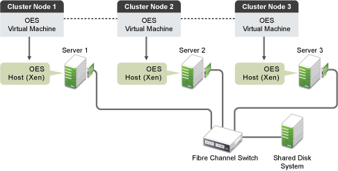 In this scenario, you have OES and Xen installed and configured on each node (physical machine). You create the OES virtual machine on each physical machine and install and configure OES Cluster Services on each virtual machine. The combined virtual machines (cluster nodes) comprise one cluster.
