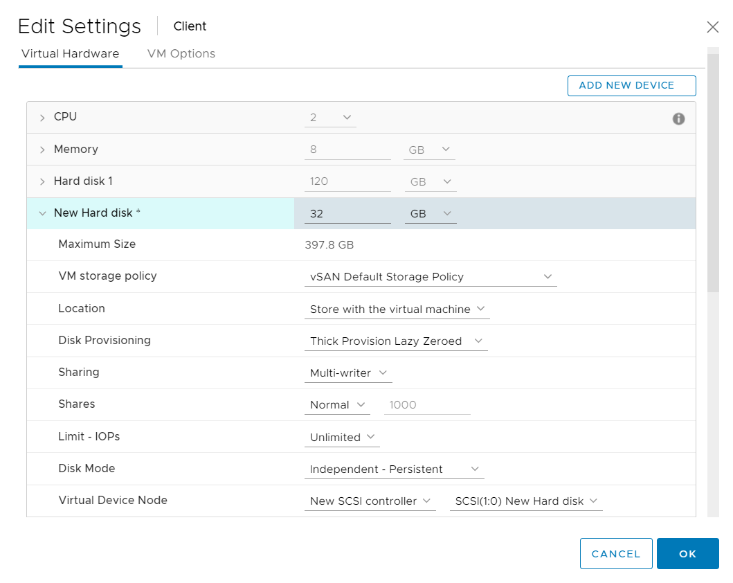 Click ADD NEW DEVICE > Hard Disk with the following settings.