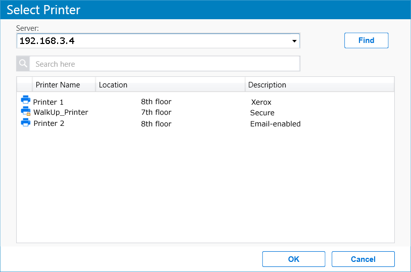 For secure or a WalkUp printer, you must login to the server. On logging in, printers are displayed through ACLs set for that user. You can login using only the username or in a LDAP format (comma separated).