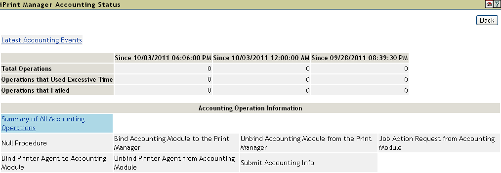 Lists all of the accounting operations that might occur with the iPrint Manager. These operations become selectable if any operation of that type has occurred. The statistics at the top of this page apply to the currently selected field.
