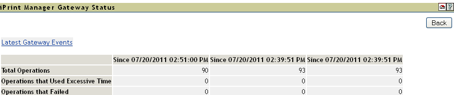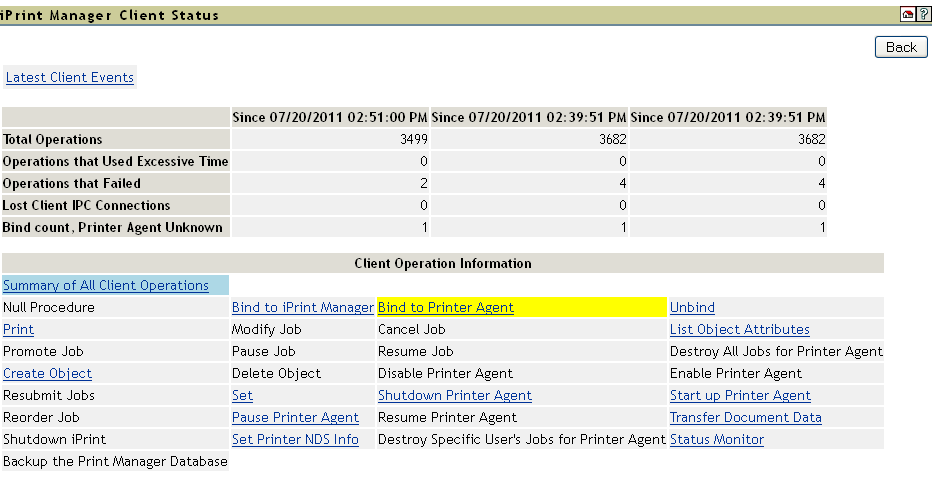 Lists all of the client operations that might occur with the iPrint Manager. These operations become selectable if any operation of that type has occurred. The statistics at the top of this page apply to the currently selected field.