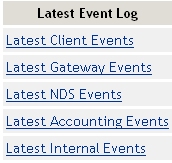 Latest Event Log: Displays the last 20 events for the given interface. You can choose to view the last 20 client events, gateway events, NDS events, accounting events, and internal events.