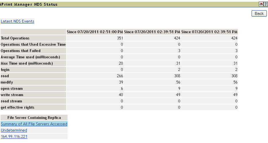 The first 15 file servers accessed by the iPrint Manager for NDS information within the last hour. Any server highlighted in yellow indicates that there has been a recent problem while processing an NDS operation to that server.