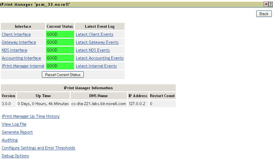 To access the Advanced iPrint Manager Information page, launch iManager, and click iPrint > Manage Print Manager > Manage Health Monitor > Advanced iPrint Manager Information.