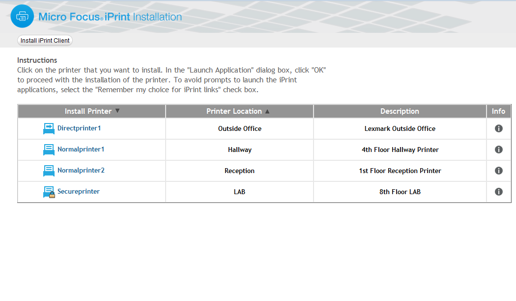 You can download and install the iPrint Client from the iPrint Printer List Web page on the server where the Print Manager is loaded.