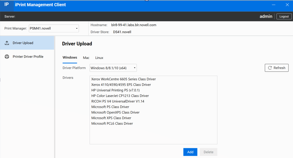 Click Add under the Driver pane, and the Add Printer Wizard with the available printer drivers is displayed. The drivers installed on your workstation are made available to be uploaded to the Driver Store. You can upload only drivers for the platforms installed on your workstation.
