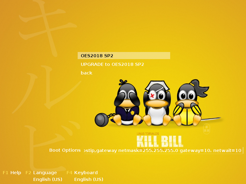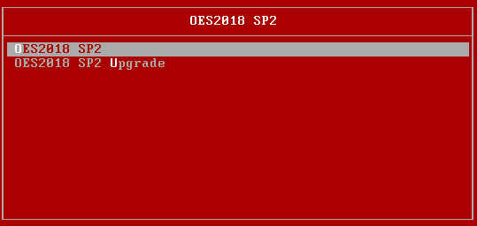 The third and final level of the boot menu structure determines how exactly the installation is going to happen. This example provides options for a new installation and for an upgrade of an existing system to OES2018 SP2:
