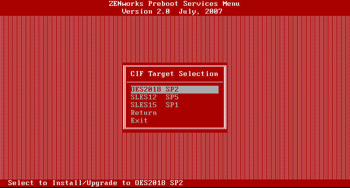 [SUBMenu_CIF] MenuTitle = CIF Target Selection option = submenu ; "OES2018 SP2"; "Select to Install/Upgrade to OES2018 SP2" ; SUBMenu_CIF_OES2018SP2 option = submenu ; "SLES12 SP5"; "Select to Install/Upgrade to SLES12 SP5" ; SUBMenu_CIF_SLES12SP5 option = submenu ; "SLES15 SP1"; "Select to Install/Upgrade to SLES15 SP1" ; SUBMenu_CIF_SLES15SP1 option = return ; "Return" ; "Return to main menu" option = exit ; "Exit" ; "Boot to local hard drive"