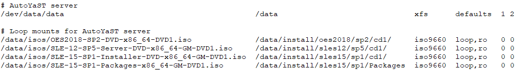 However, to protect against unintended alterations of installation sources we very strongly recommend to place the ISO files of the different installation media into a directory /data/isos and to loop mount them read-only to /data/install/<product><version>/<sp>/cd1 through /etc/fstab. In case of an initial release of a product fcs, ga, or sp0 can be used instead of <sp>.