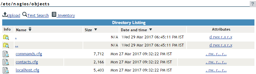 Templates for Nagios object configuration files are in the /etc/nagios/objects directory. When you start or restart Nagios, it caches the object definitions in the /var/lib/nagios/objects.cache file. The CGIs read information from the cache file, rather than directly from the object configuration files, in order to prevent inconsistencies that can occur if you modify the configuration files after Nagios starts. Thus, if you modify a configuration file, you must restart Nagios to apply the change.