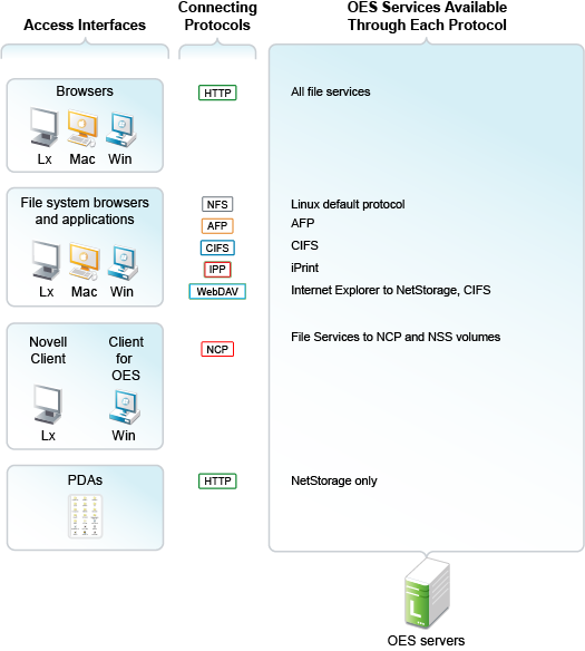 Figure 14-3 illustrates the access interfaces available to users in OES and the services that each interface can connect to. It also shows the protocols that connect access interfaces with network services.