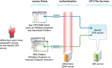 CIFS: Provides native Windows (CIFS and HTTP-WebDAV) access to files stored on an NSS volume on an OES server.