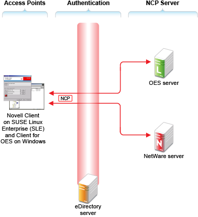 Figure 16-1 illustrates the basics of NCP file services. For more information on how NCP can help you manage access to network resources, see Access Control and Authentication.