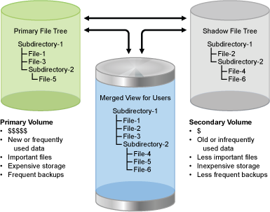 Dynamic Storage Technology (DST) allows you to specify a shadow relationship between two volumes to form a shadow volume pair. The secondary directory tree structure, or secondary file tree, shadows the primary file tree. The primary tree and the secondary tree are overlaid to create one virtual volume tree that is transparently presented to the users. Users see a merged view of the files on both volumes.