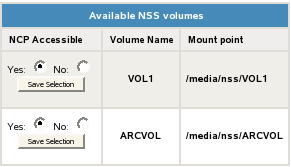 If the volume’s NCP Accessible setting is No, click Yes to make the NSS volume accessible to NCP so that the volume is automatically mounted in NCP after it is mounted in NSS.