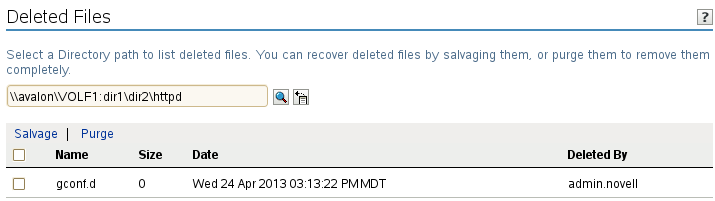 As an administrator, you can use the Files and Folders plug-in to iManager to salvage or purge deleted files from an NSS volume where the Salvage attribute is enabled. When salvaging deleted files, the file content, trustees, trustee rights, and inherited rights filter are just as they were before the file was deleted. If the rights in the tree above the salvaged file have changed, then the inherited rights for the salvaged deleted file is calculated based on the current rights above it in the directory tree.