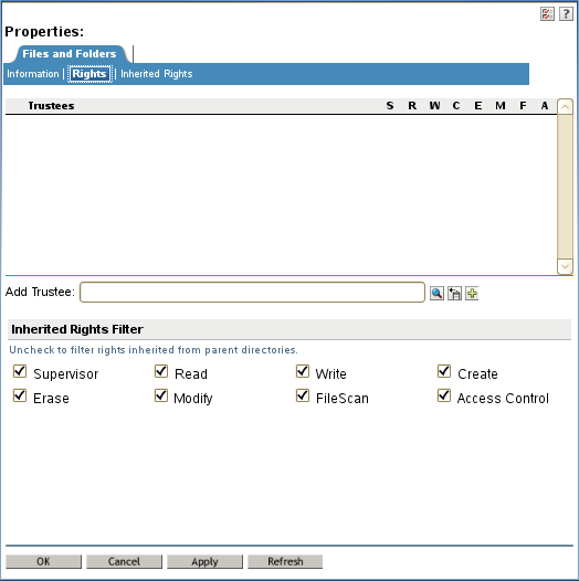 For example, in iManager, the Files and Folders plug-in allows you to view or modify the Inherited Rights Filter for a selected file or folder by viewing its Properties, then clicking the Rights tab. By default, all rights (SRWCEMFA) are allowed to be inherited, as shown in Figure 5-2. You deselect a right to disable it from being inherited by the file or folder. That is, the right is masked so that it cannot flow down.