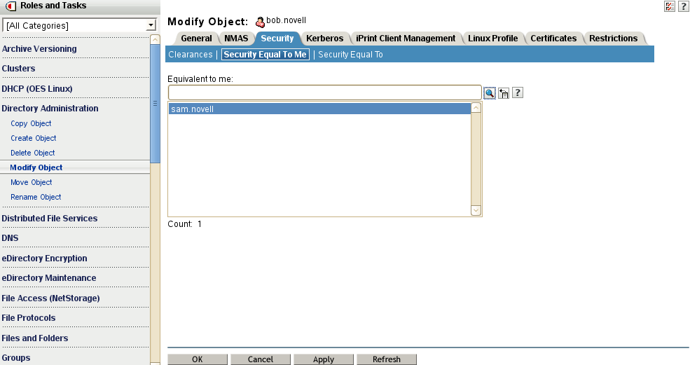 For example, in iManager, you can use the Directory Administration > Modify Object option to make a User object named sam to be the security equivalent to the User object named bob, as shown in Figure 5-3. After you create the security equivalence, sam effectively has the same rights to the file system tree as those explicitly assigned to bob.