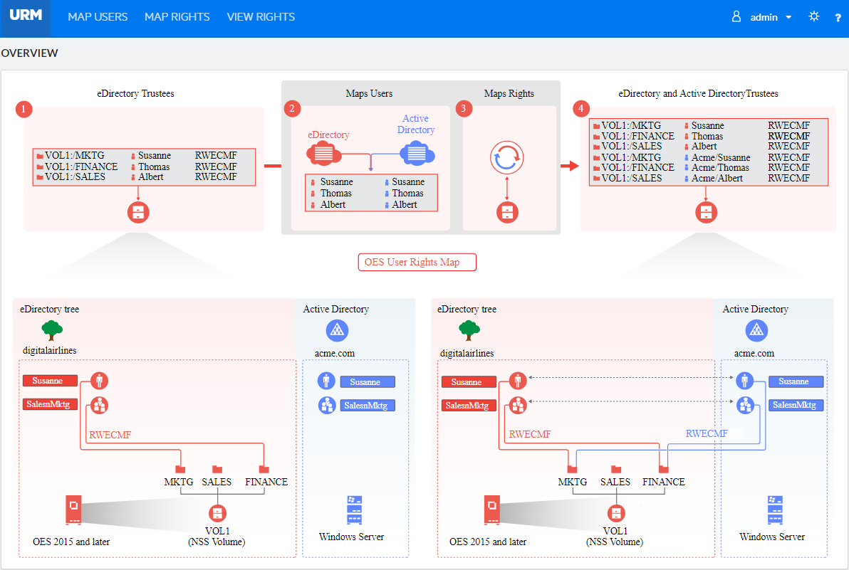The OES User Rights Map (NURM) utility is used by administrators to map the Access Control List (ACL) of NSS resource that is owned by an identity in eDirectory to an identity in Active Directory. It maps the users and groups from eDirectory to Active Directory using a common name or any other field that is selectable by the tool. With this utility, the administrators can:
