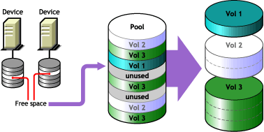 You can use NSS pools and volumes to store applications, files, and databases. You create storage pools by assigning areas of free space obtained from one or more of a server’s storage devices. You can create one or more NSS volumes from the space in the storage pool. The following figure shows how NSS uses free space on multiple devices to create a storage pool.