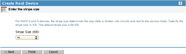 Stripe Size: If this is a RAID 0 or 5 device, set the stripe size. For information, see Determining the Stripe Size for RAID 0 and RAID 5.
