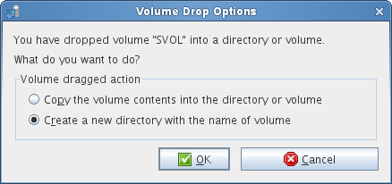 In the Volume Information tab, in the Source Server tree, select volumes or folders that you want to migrate, then drag and drop it in the Target Server tree. The Volume Drop Options dialog-box is displayed. Select Create a new directory with the name of volume option under Volume dragged action and then click OK.