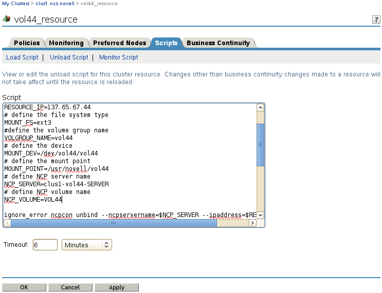 Click the Unload Script link to view or modify the unload script. Click Apply if you make changes.