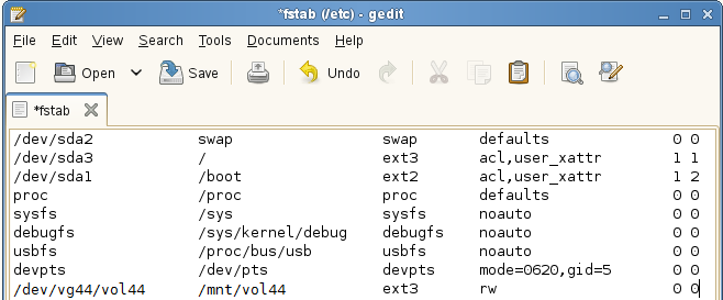 /dev/vol44/vol44 /media/ext3/vol44 ext3 rw 0 0