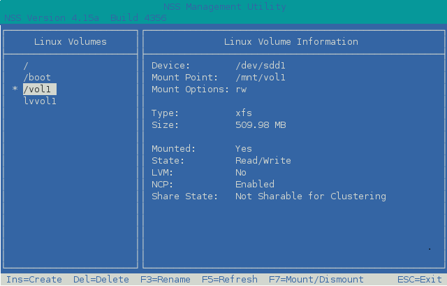 From the NSSMU main menu, select Linux Volumes, then press Enter.
