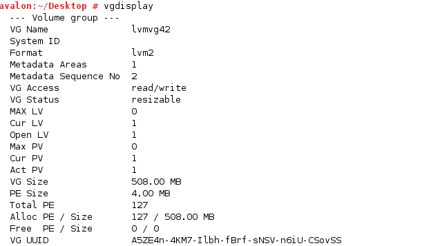nlvm list linux volumes Name Group Mounted Size Shared Type LVM NCP Mountpoint / Yes 15.98GB No ext3 No No / /boot Yes 297.00MB No ext2 No No /boot lvmvol42 lvmvg42 Yes 508.00MB No xfs Yes No /mnt/vol42 LVMVOL41 LVMVOL41 Yes 508.00MB No ext3 Yes Yes /usr/novell/LVMVOL41 LVMVOL43 lvmvg43 Yes 508.00MB No xfs Yes Yes /mnt/vol43