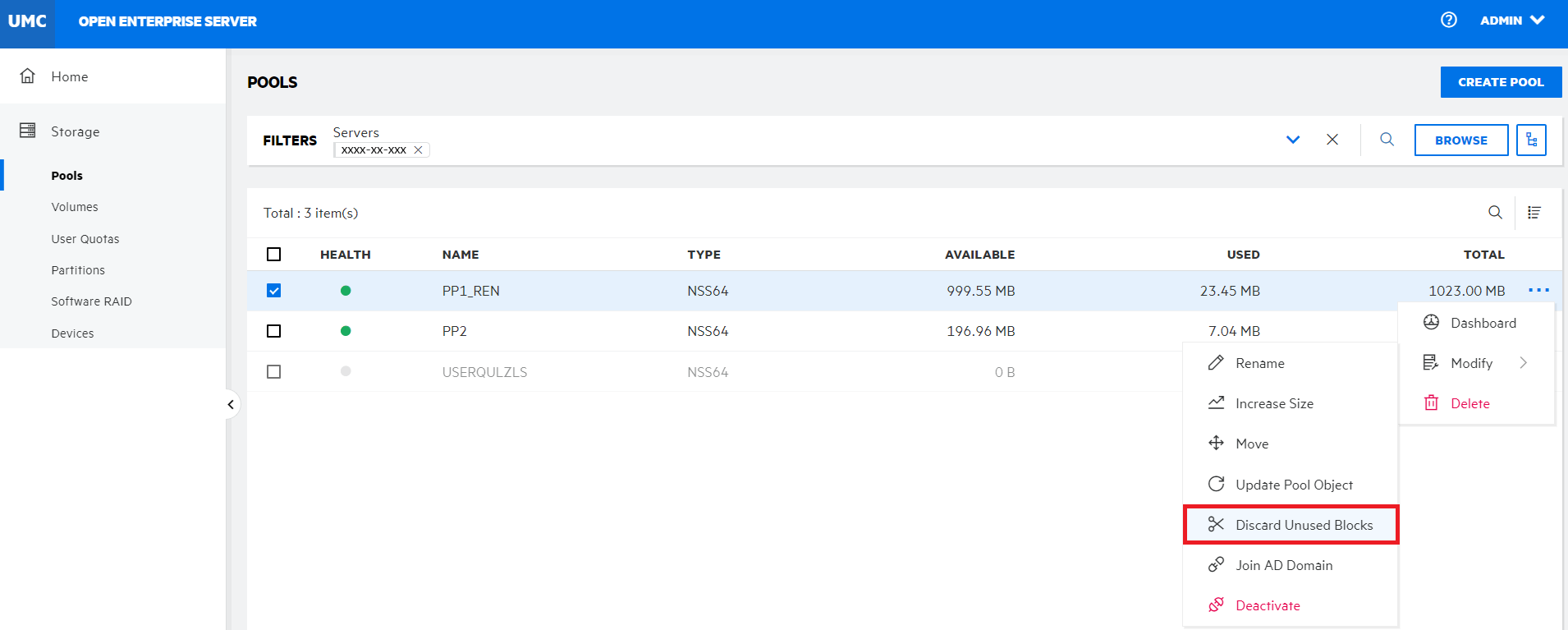 Click CONFIRM to discard the unused blocks in the selected pool.