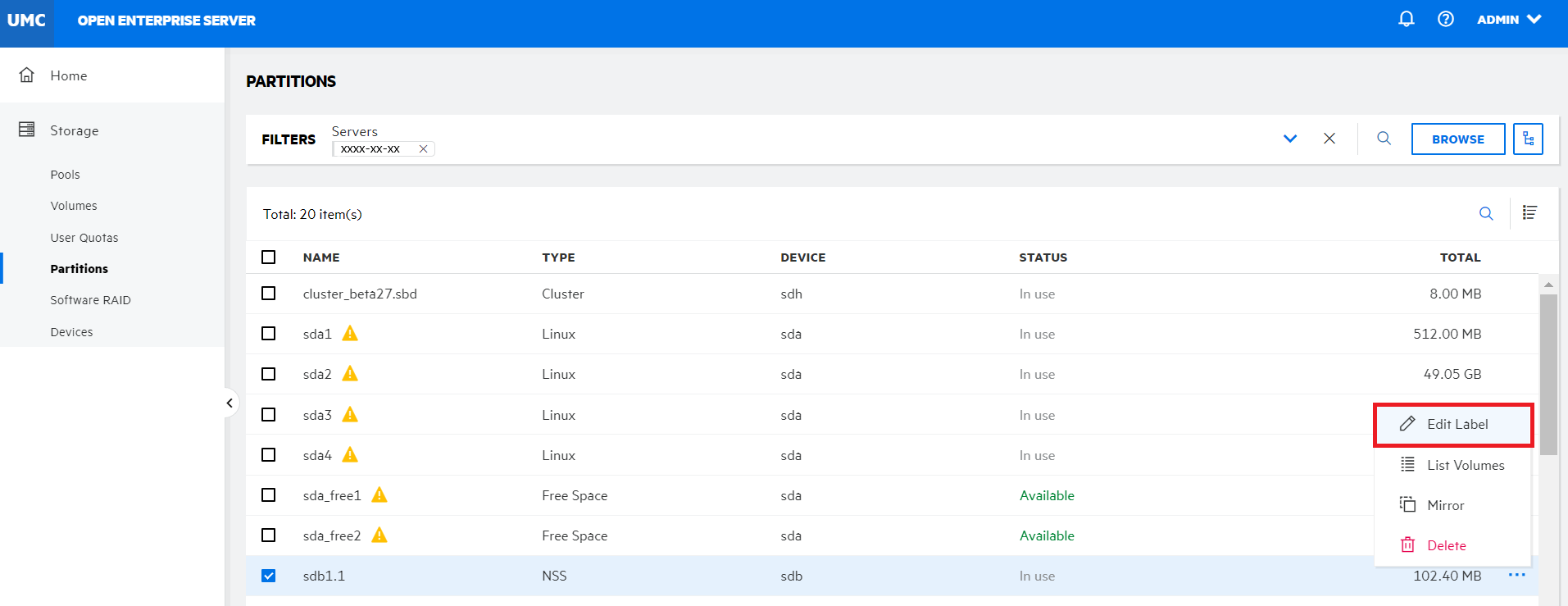 A Label is the partition name assigned by the administrator and must be unique on a server. You can edit label of a partition by using the Edit Label option.