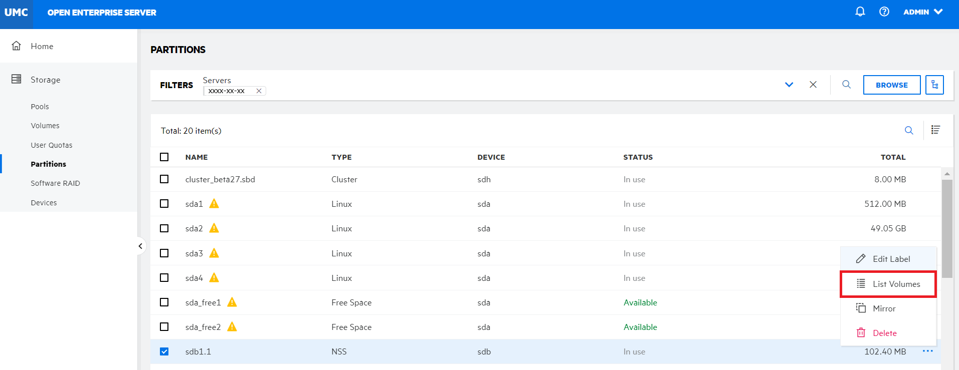 Search or browse the servers to list the partitions associated with them.