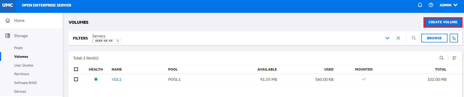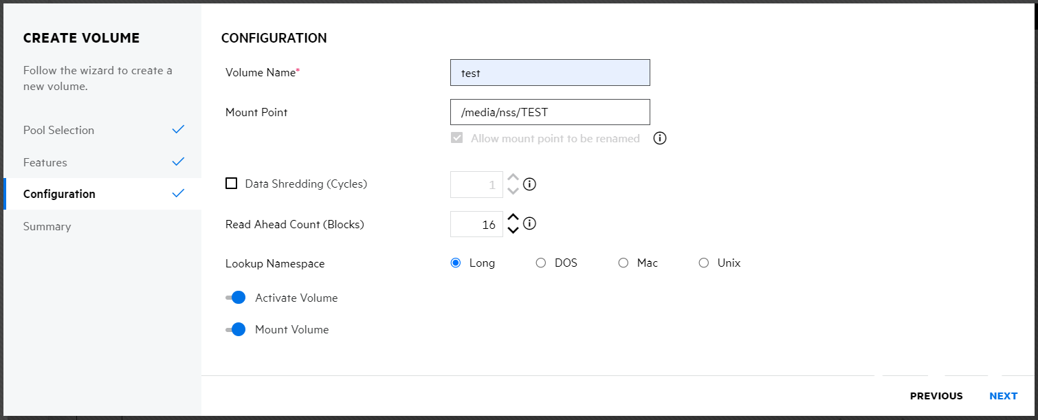 On the CONFIGURATION page, specify a name for the new volume, and click NEXT.