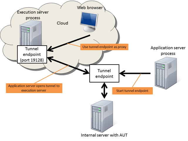Silk Central Connect は、Silk Central のアーキテクチャをベースにしています。さらに、クラウド ベースの実行サーバーを使用することができます。クラウド ベースの実行サーバーを使って、イントラネット上の内部 Web アプリケーションをテストする場合は、ローカル イントラネット Web サイトのテスト用のトンネル設定を行うことができます。この設定を行うと、Silk Central アプリケーション サーバーはクラウド ベースの実行サーバーへのトンネルを開き、ローカル イントラネットの Web サイトのテストを可能にするためのプロキシとして動作します。このオプションは直接接続に比べて遅いため、必要な場合にのみ選択してください。