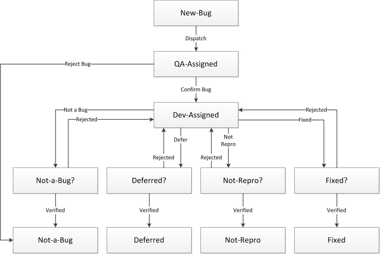 Vous pouvez également découvrir que certaines actions positives sont manquantes en examinant chaque parcours emprunté par un incident. Vous pouvez, par exemple, réaliser que les ingénieurs QA rejettent également des rapports d'incident, fermant ainsi les incidents. Dans l'exemple de diagramme ci-dessous, l'action Rejeter l'anomalie effectuée par un ingénieur QA aboutit à l'état Pas une Anomalie. Assurez-vous que toutes les actions aboutissent à un état final.