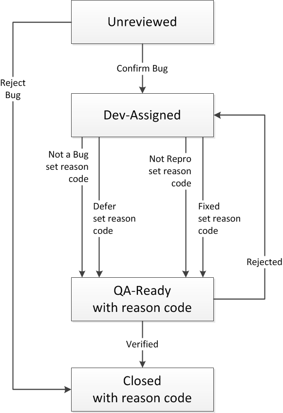 The next-to-last row can also be collapsed into a single state that recognizes QA’s role in verifying Development’s claims. You might call this state QAReady. You can use reason codes here to explain why a bug has changed states (for example, a bug arrives in the QA-Ready state with a reason code of Fixed or Deferred). The four Rejected actions taken by QA can be collapsed into a single Rejected action. Similarly, the four Verified actions taken by QA can be collapsed into a single Verified action.