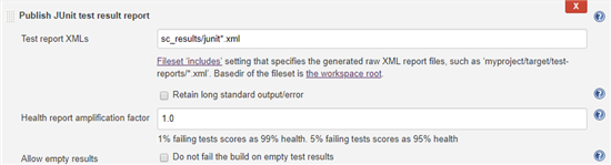 4. Specify the location, to which the script writes the files to, in the Test report XMLs field. For example sc_results/junit*.xml.