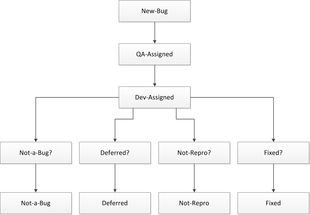 L'exemple suivant présente un petit échantillon des états qui pourraient figurer dans votre propre workflow. Lorsqu'une nouvelle anomalie est saisie, un membre de votre organisation l'envoie à l'ingénieur QA adéquat pour examen. Si l'ingénieur QA atteste que le comportement signalé constitue une nouvelle anomalie, celle-ci est alors envoyée au service Développement pour être corrigée. Le service Développement peut mettre en œuvre différentes actions pour corriger l'anomalie.
