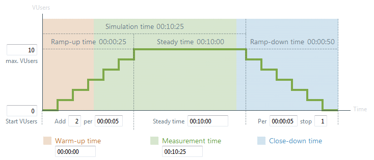たとえば、10 人の仮想ユーザーで負荷テストを開始し(開始仮想ユーザー数)、仮想ユーザーのが最大 20 人に到達するまで(最大仮想ユーザー数)、30 秒ごとに(間隔)、2 人の仮想ユーザーを追加する(追加)ように指定できます。