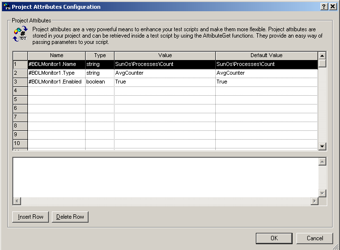 The values in the project attributes identify a single measure. Several attributes (lines in the dialog) may be required to create a measure however. For example, all entries beginning with #BDLMonitor1 in the above example. This is how settings are defined for a measure.