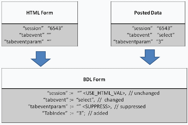 By taking advantage of form field usage attributes, it can be specified that a field with the name tabeventparam must not be sent, but that an additional field with the name TabIndex should be sent. So the form tabform can be submitted in a context-full way using the WebPageSubmit function.