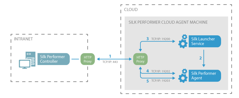 - コントローラは、HTTP プロキシおよびポート 443 経由で Silk Launcher Service への初期接続を開きます。Silk Performer は、セキュアな接続の場合はデフォルトのポート番号 443 を自動的に使用します。社内ポリシーにより必要となる場合は、追加の HTTP プロキシ経由で接続が行われます。