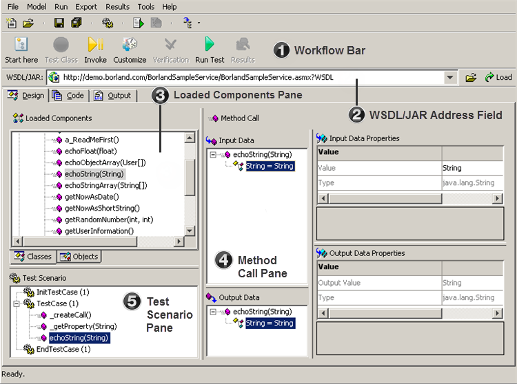 • The Output Data menu tree shows the output parameters (header and body) of the last/selected method call.