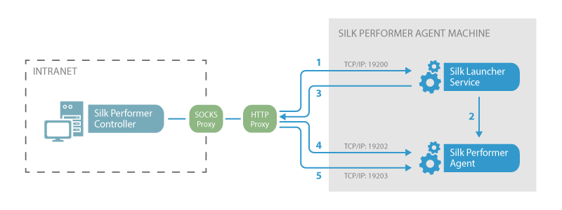 SOCKS プロキシおよび HTTP プロキシを連続で使用するように、Silk Performer エージェントの接続を構成できます。この場合、エージェントは最初に SOCKS プロキシに接続し、次に HTTP プロキシに接続します。